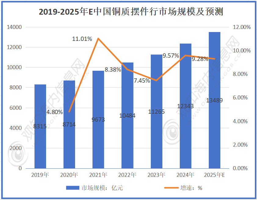 根据数据显示:2019年规模为8315亿元,2020-2023年分别增长至8714亿元、9673亿元、10484亿元、11265亿元。2024年预计达12343亿元,2025年将达13489亿元。行业规模持续扩大,增速虽有波动但整体保持较高水平,反映出中国铜质摆件市场发展态势良好,需求逐步增加。