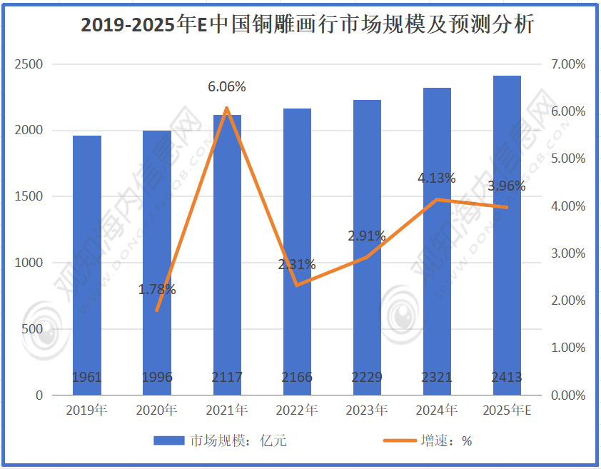 根据数据显示:2019年规模为1961亿元,2020-2023年分别增长至1996亿元、2117亿元、2166亿元、2229亿元。2024年预计达2321亿元,2025年将达2413亿元。行业规模持续稳定增长,增速虽有波动但整体较为平稳,反映出中国铜雕画市场发展态势良好,需求呈稳步上升趋势。