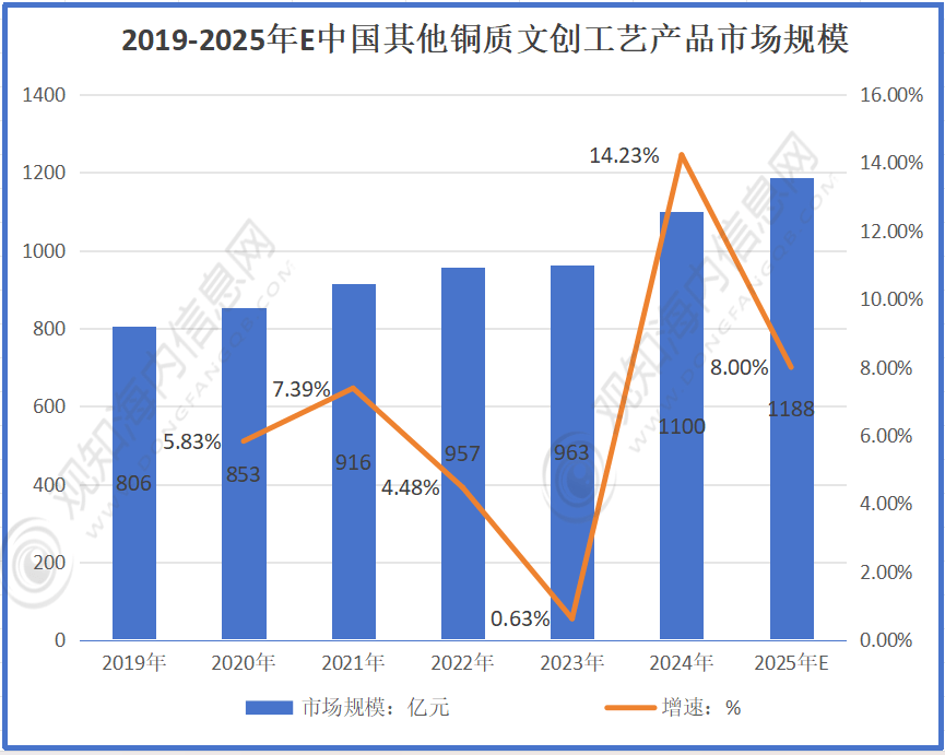 根据数据显示:2019年规模为11082亿元,2020-2023年分别增长至11563亿元、12706亿元、13607亿元、14457亿元。2024年预计达15764亿元,2025年将达17390亿元。行业规模持续快速增长,增速虽有波动但整体保持较高水平,反映出中国铜质文创工艺产品市场发展态势良好,前景广阔。