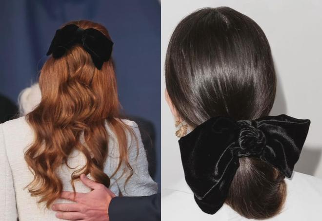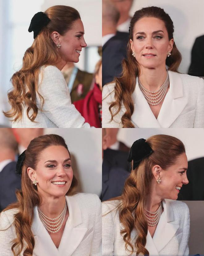 这次,凯特王妃罕见的尝试了半扎发+黑色蝴蝶结发饰,打破以往的发型,让她看起来甜美俏皮,年轻了许多。