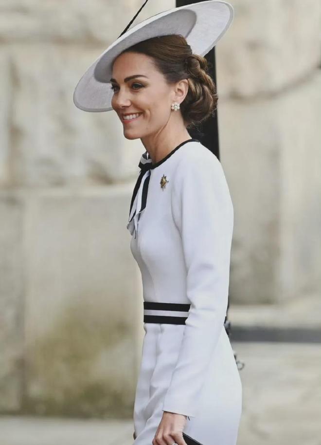 凯特王妃恢复健康后第一次出席查尔斯三世官方生日皇家阅兵仪式,身穿一袭Jenny Packham白裙,搭配的也是珍珠耳饰!