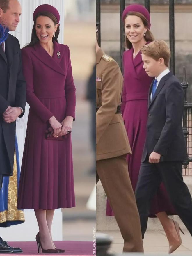 5月5日,凯特王妃重穿了22年11月迎接南非Boss时穿过的EW大衣裙,礼帽也同样搭配的Sean Barrett药盒帽,鞋履则搭配的Ralph Lauren。