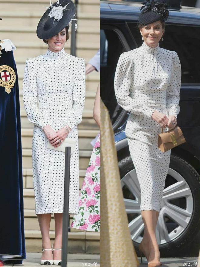 在同一天的穿搭中,凯特王妃也是重穿了23年出席嘉德日穿过的Alessandra Rich白色波点连衣裙,搭配了Juliette Botterill黑色羽毛网纱礼帽,就连DeMellier深太妃糖色手拎包也是曾经的款式。